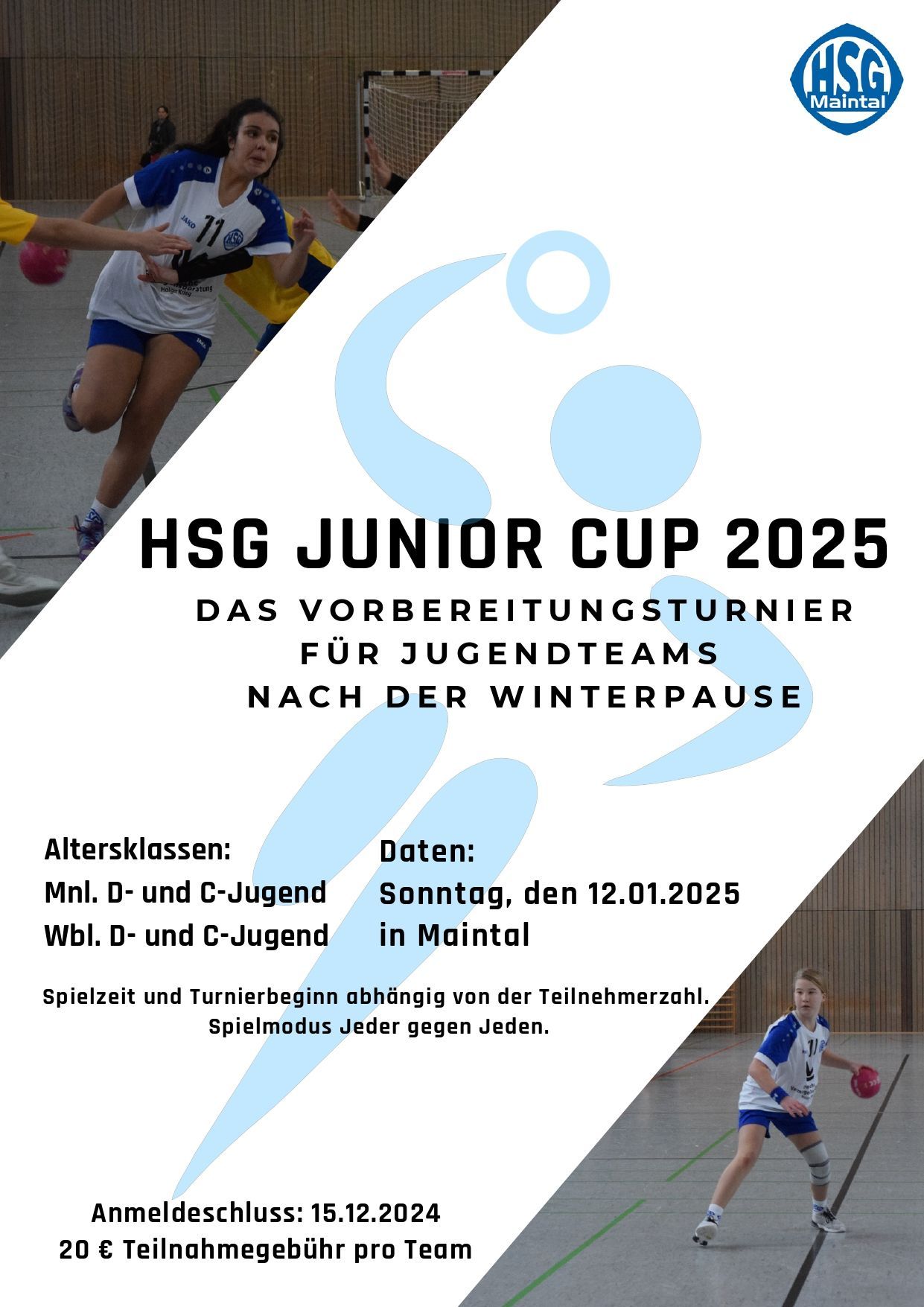 Die HSG Maintal richtet am letzten Wochenende der Winterferien (Sonntag den 12.01.2025) den Junior-Cup 2025 aus. Gespielt wird in Turnierform jeder gegen jeden in den Altersklassen der männlichen und weiblichen D-/C-Jugend. Die Anmeldung kann ab sofort erfolgen, Meldeschluss ist der 15.12.24 (Gebühr: 20 Euro).
